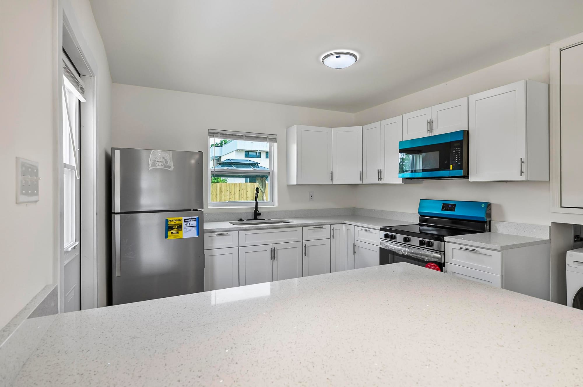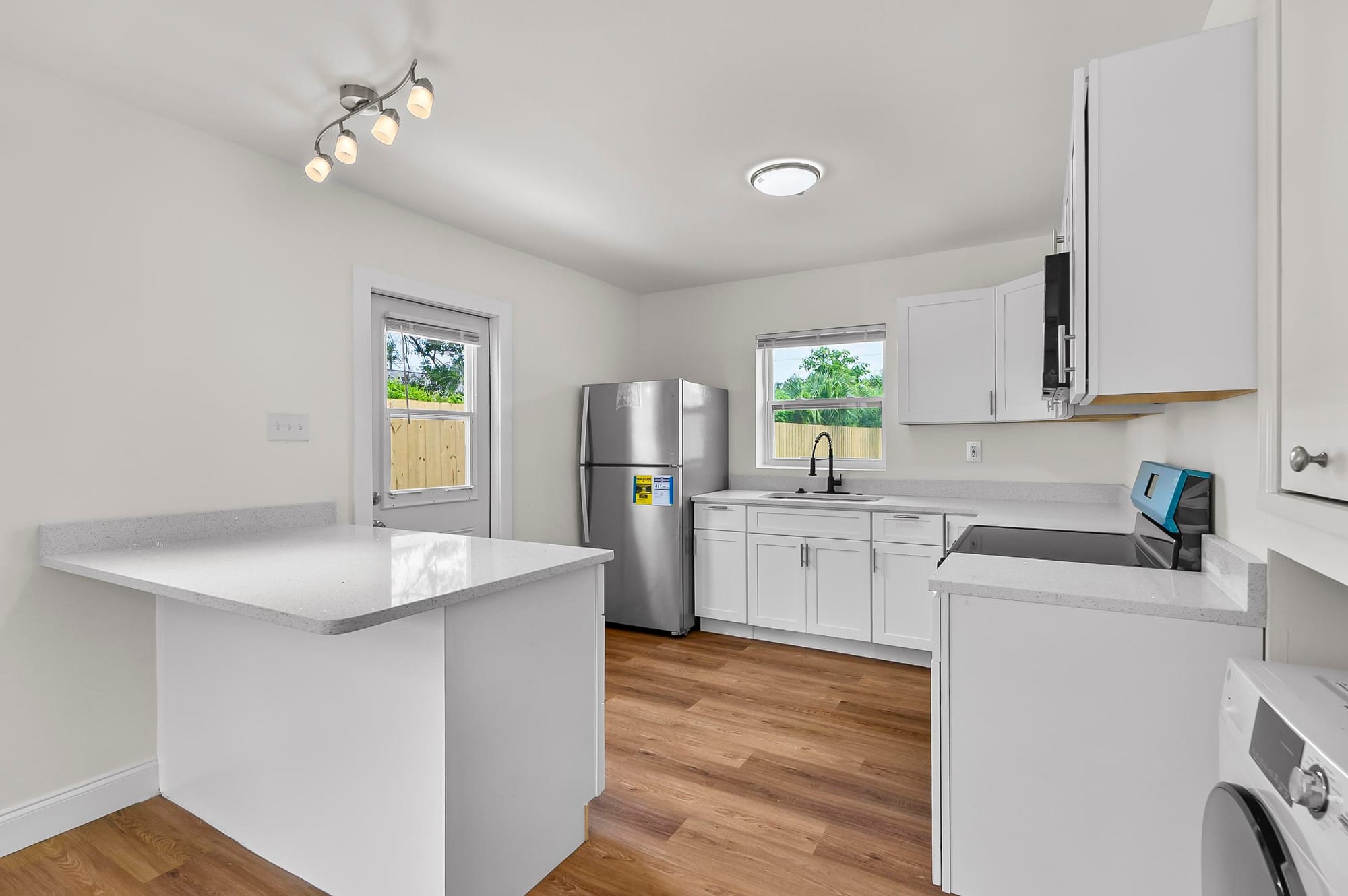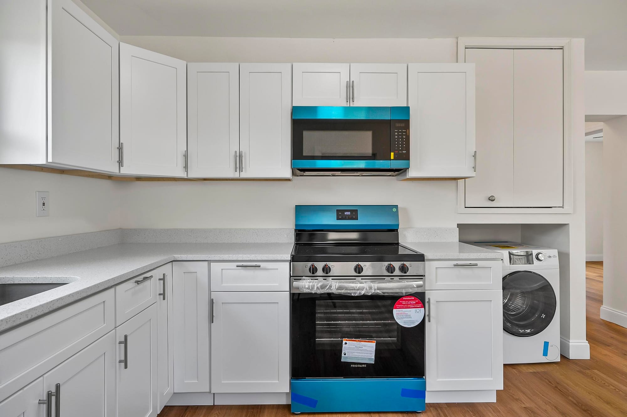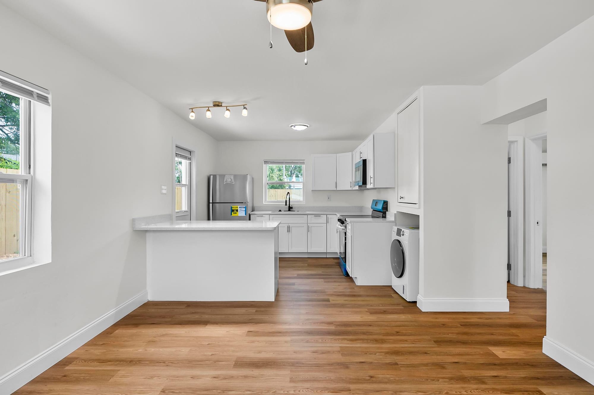 Inside, updates include new windows, fresh paint, updated flooring, and a fully renovated kitchen and bathroom. The kitchen showcases quartz countertops, a sleek peninsula, new appliances, and a space-saving washer/dryer combo.